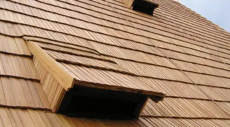 Během této akce jsme na Špitálním kostele Všech Svatých nahradili starý řezaný "chebaňácký šindel" novým modřínovým štípaným šindelem s perem a drážkou. Kostel je přístupný veřejnosti a stojí za návštěvu díky svému impozantnímu gotickému krovu s několika patry. Práce na střeše hlavní lodi se sklonem 62° byla výzvou, zvláště při práci na laně. Proto jsme vyvinuli speciální závěsnou lávku, použitelnou pro střechy se sklonem od 30° do téměř 90°. Jak se říká, Češi si vždy poradí!