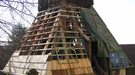 Velice zajímavá práce na vzácném historickém objektu byla náročná v množství a tvarování ostrých nároží. Dřevěný štípaný šindel délky 60 cm, dnes již méně užívaný, bylo nutné vytvořit individuelně. Odměnou za tuto práci byla možnost vidět z blízka původní tesařskou práci starou několik staletí.